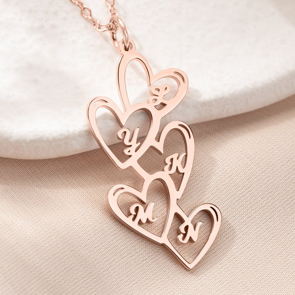 This personalized necklace features charming heart-shaped pendants, each enclosing a letter. You can customize 1 to 5 hearts and corresponding letters, each representing a family member or meaningful symbol, turning it into a meaningful keepsake that carries precious family memories and emotional significance.