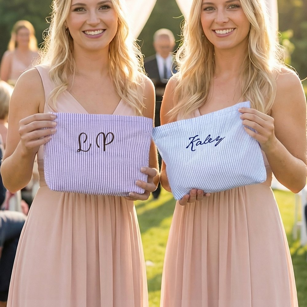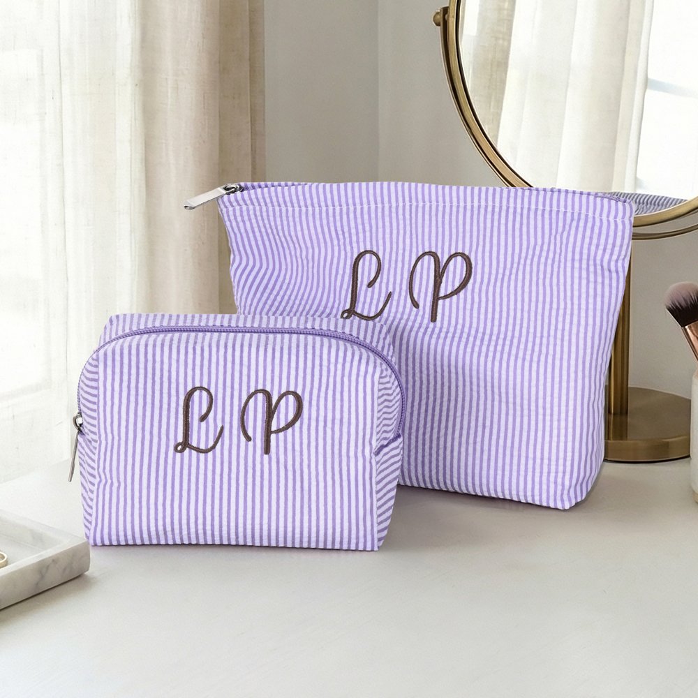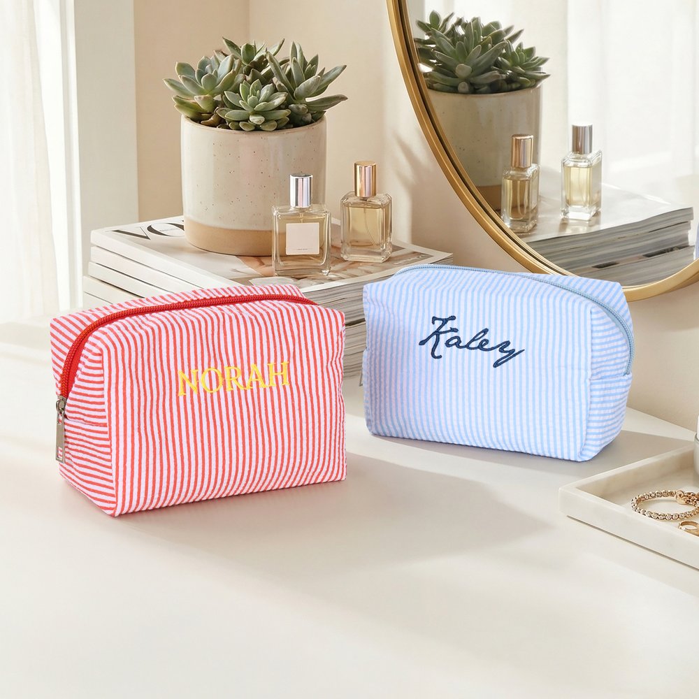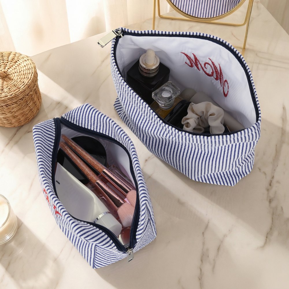 Fresh and minimalist in style, this custom striped embroidered makeup bag features a classic vertical stripe, textured fabric with multiple fresh base colors to choose from. Personalize it with custom name embroidery—delicate stitching gives the letters a crisp, dimensional look. Available in two styles: bag or pouch, with sizes to suit different storage needs. Blends practical organization with personalized design, making every makeup bag a unique personal accessory that's both beautiful and functional.