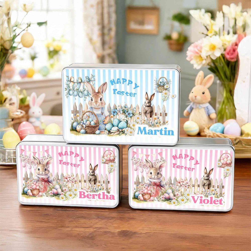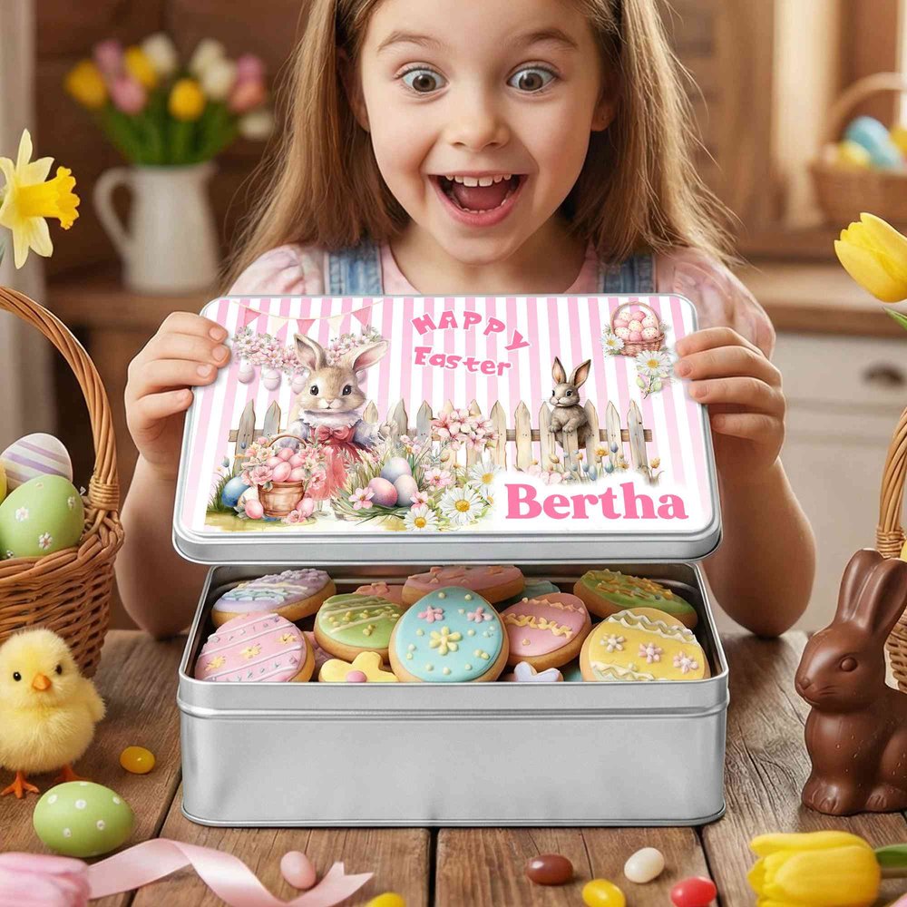 Personalized Happy Easter Cute Bunny Easter Egg Biscuit Tin Storage Box with Name Easter Party Gift for Boys Girls