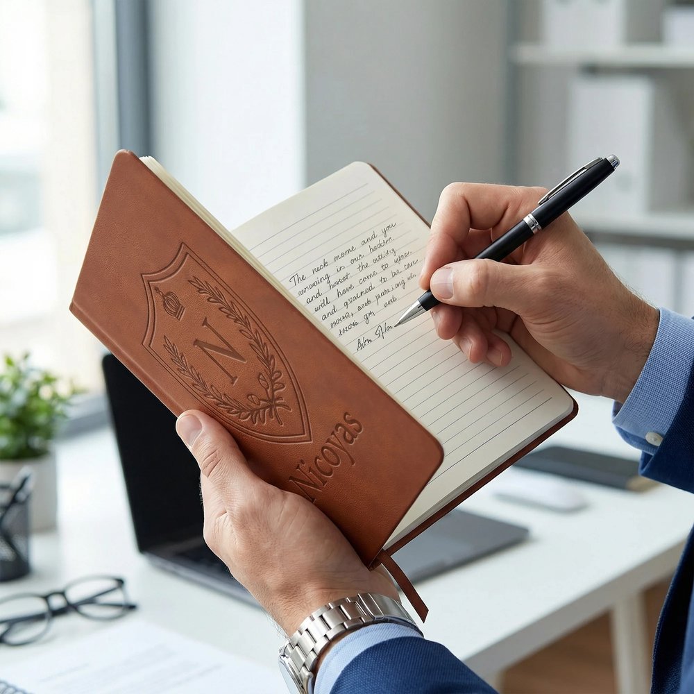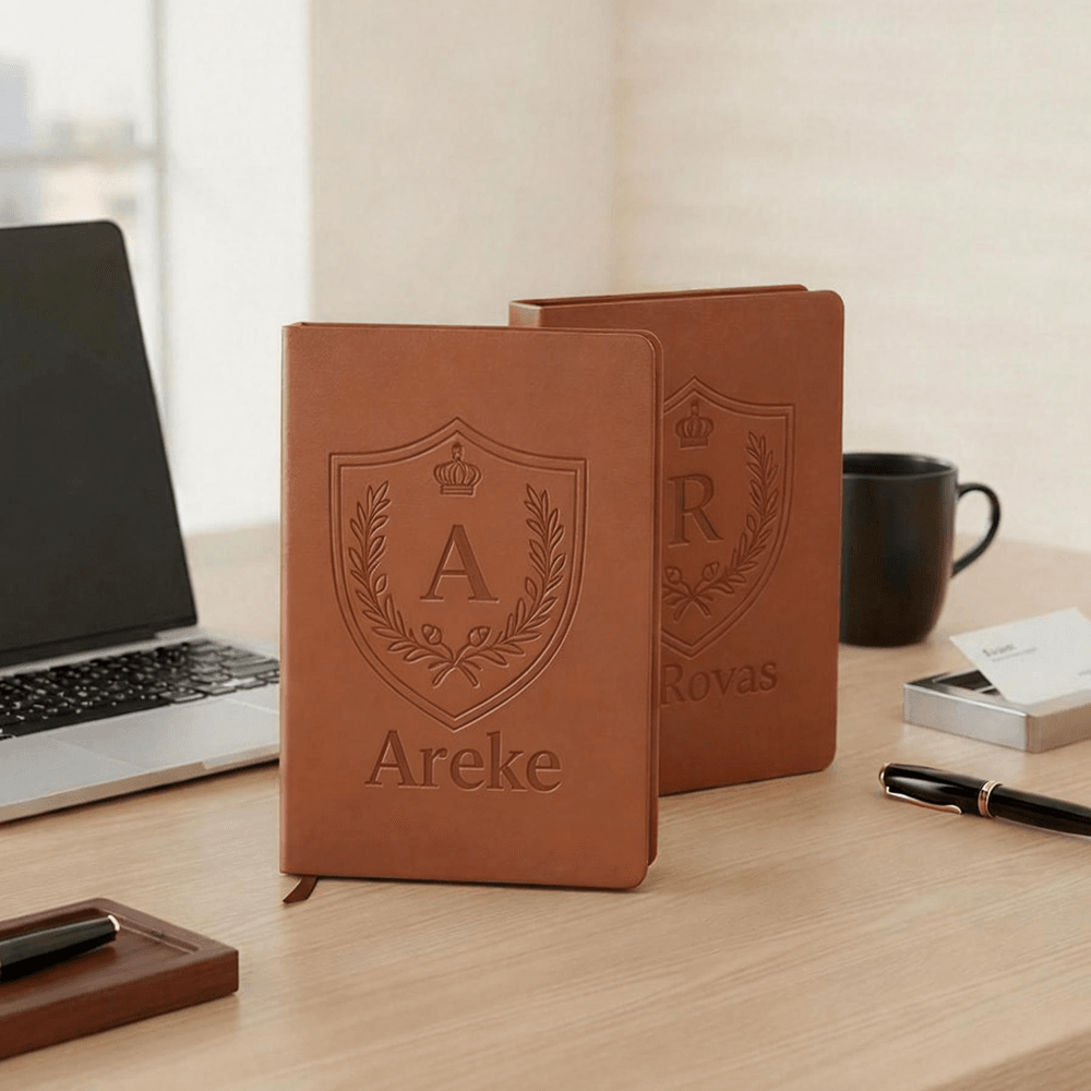Crafted for the modern gentleman, this custom PU leather notebook blends timeless classic styling with exclusive personalization. It features a premium warm brown leather cover, embossed with a shield crest design adorned with a crown and laurel wreath details. You can fully customize the central initial and full name to create a one-of-a-kind piece.